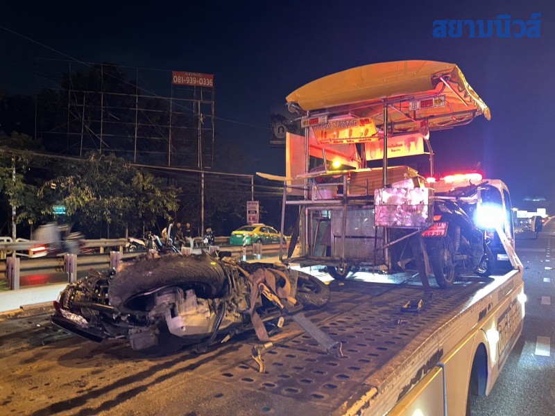ที่เกิดพบรถบรรทุกพ่วง 18 ล้อยี่ห้อ ฮีโน่ ทะเบียน ส่วนหัว 65-9492 กทม.ท้ายพ่วงทะเบียน 66-1444 กทม.ที่ด้านท้ายถูกรถยนต์เก๋งอีก 3 คันลักษณะชนท้ายต่อกัน ใกล้เคียงยังพบรถจักรยานยนต์พ่วงข้างขายของล้มตะแคงพังเสียหาย และยังมีรถจักรยานยนต์อีก 1 คันพังเสียหายด้วย โดยเหตุการณ์นี้มีผู้บาดเจ็บที่มากับรถเก๋งเป็นหญิง 2 รายและ จักรยานยนต์พ่วงข้างเป็นชาย 1 รายรถจักรยานยนต์เป็นชาย 1 รายรวม 4 ราย ห่างออกไปประมาณ 50 เมตรพบรถยนต์เก๋ง กระบะ และจักรยานยนต์รวม 4 ค้นมีผู้บาดเจ็บอีก 2 ราย รวมเหตุการณ์นี้มีผู้บาดเจ็บทั้งหมด 6 ราย รถเสียหายทั้งหมด 10 คันเจ้าหน้าที่กู้ภัยช่วยเหลือนำตัวส่งคนเจ็บส่งโรงพยาบาลอย่างเร่งด่วน หลังเกิดเหตุทางเจ้าหน้าที่ต้องเร่งทำการเคลื่อนย้ายรถทั้งหมดและเปิดการจราจรโดยใช้เวลานานกว่า 2 ชั่วโมง ขณะเดียวกันกล้องวงจรปิดสามารถบันทึกภาพเหตุการณ์ได้วินาทีที่รถจักรยานยนต์เฉี่ยวชนรถจักรยานยนต์พ่วงข้างขายของทำให้เกิดเหตุรถเก๋งชนท้ายรถบรรทุกพ่วงซ้ำซ้อนอย่างรุนแรง