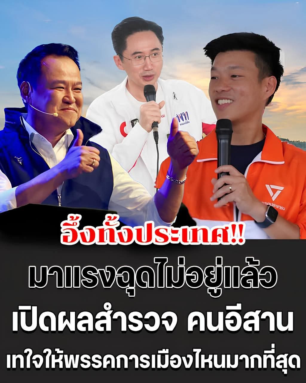 โดยผลสำรวจชี้ชัดว่า หากเลือกตั้ง สส. วันนี้ คะแนนนิยมแบบบัญชีรายชื่อของคนอีสาน กระจุกตัวอยู่ที่ 3 พรรคใหญ่แบบสูสี จนเกิดภาวะ สามก๊ก อย่างแท้จริง