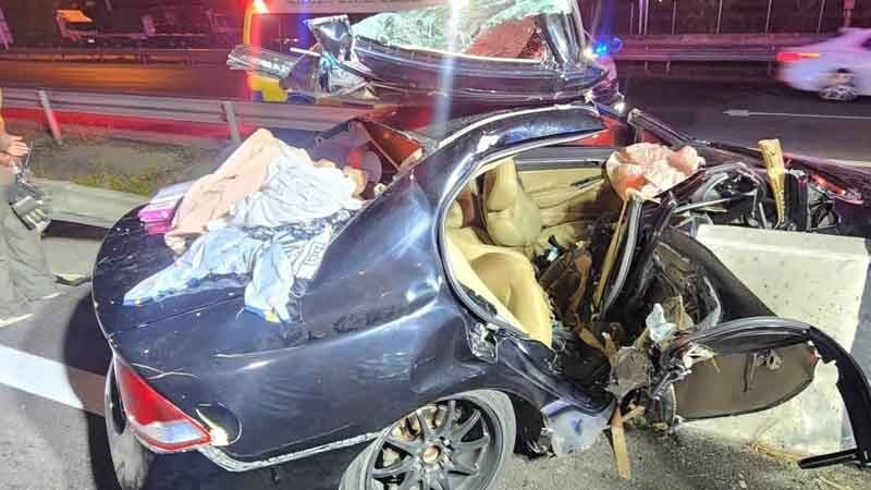 ที่เกิดเหตุอยู่บนถนนมอเตอร์เวย์ ฝั่งขาเข้า พบรถยนต์ ยี่ห้อฮอนด้า รุ่นซีวิค สีดำ ทะเบียน ญฎ 8005 กรุงเทพมหานคร เสียหลักพุ่งชนติดคาแบริเออร์เกาะกั้นกลางถนน สภาพรถพังยับเยิน กระจกแตกร้าวทุกบาน บริเวณช่วงกลางลำฝั่งคนขับไปจนถึงช่วงท้ายรถหักบิดงอทะลุแบริเออร์ไปยังฝั่งขาออก