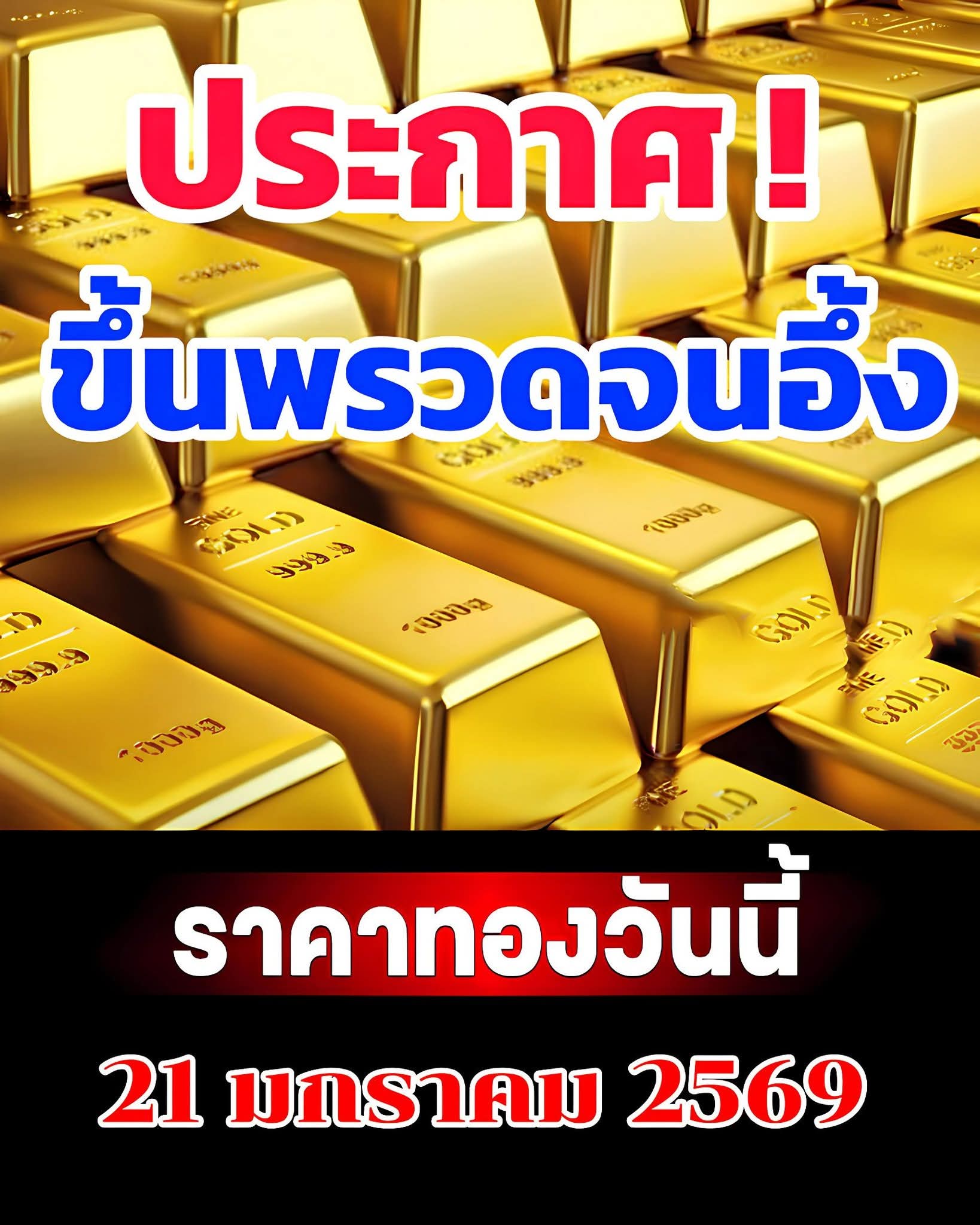 รายงานราคาทองวันนี้ประจำวันพุธที่ 21 มกราคม 2569 ประกาศครั้งที่ 1 (เปิดตลาด) เมื่อเวลา 09.03 น. ปรับขึ้นสูงถึง 1,050 บ.