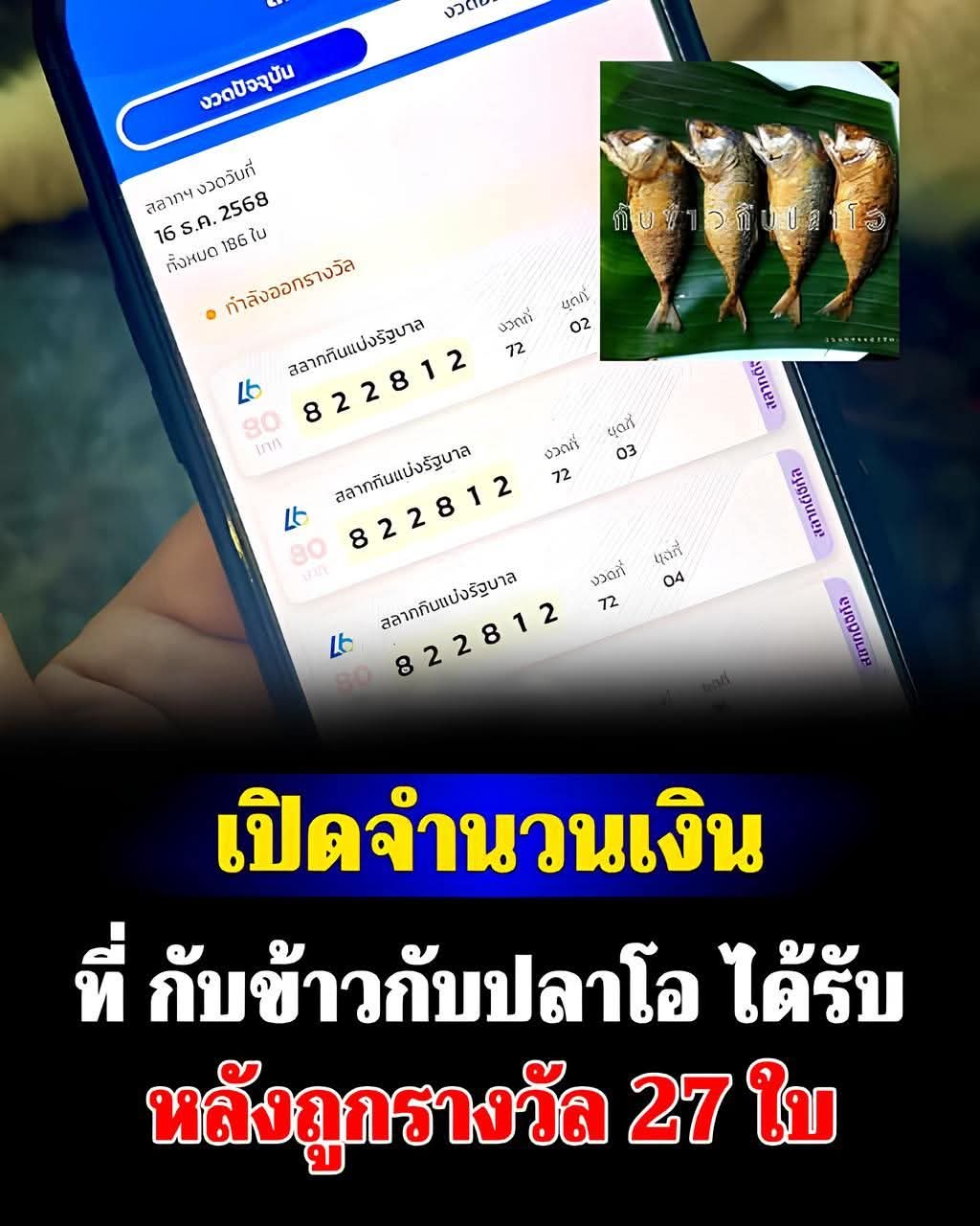 ออกไปเป็นที่เรียบร้อยแล้ว สำหรับการประกาศผลรางวัลสลากกินแบ่งรัฐบาลประจำวันที่ 16 ธันวาคม 2568 ล่าสุด เพจเฟซบุ๊ก กับข้าวกับปลาโอ Plaocooking ได้โพสต์ภาพลอตเตอรี่พร้อมระบุข้อความว่า 822 มาแล้ว รางวัลที่ 4 27 ใบฮะ