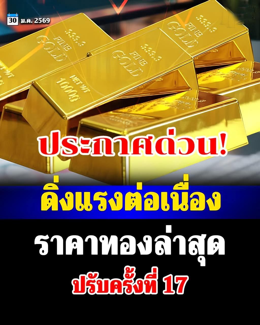 ราคาทอง โดยสมาคมค้าทองคำ รายงานราคาทองวันนี้ (30 ม.ค. 69) เปิดตลาดราคาทอง ราคาทองปรับลง 2,550 ขายออกที่บาทละ 78,950 บาท โดยทองคำแท่งรับซื้อที่ 78,850 บาท ขายออกที่ 78,950 บาท ทองรูปพรรณรับซื้อที่ 77,270.52 บาท ขายออก 79,750 บาท