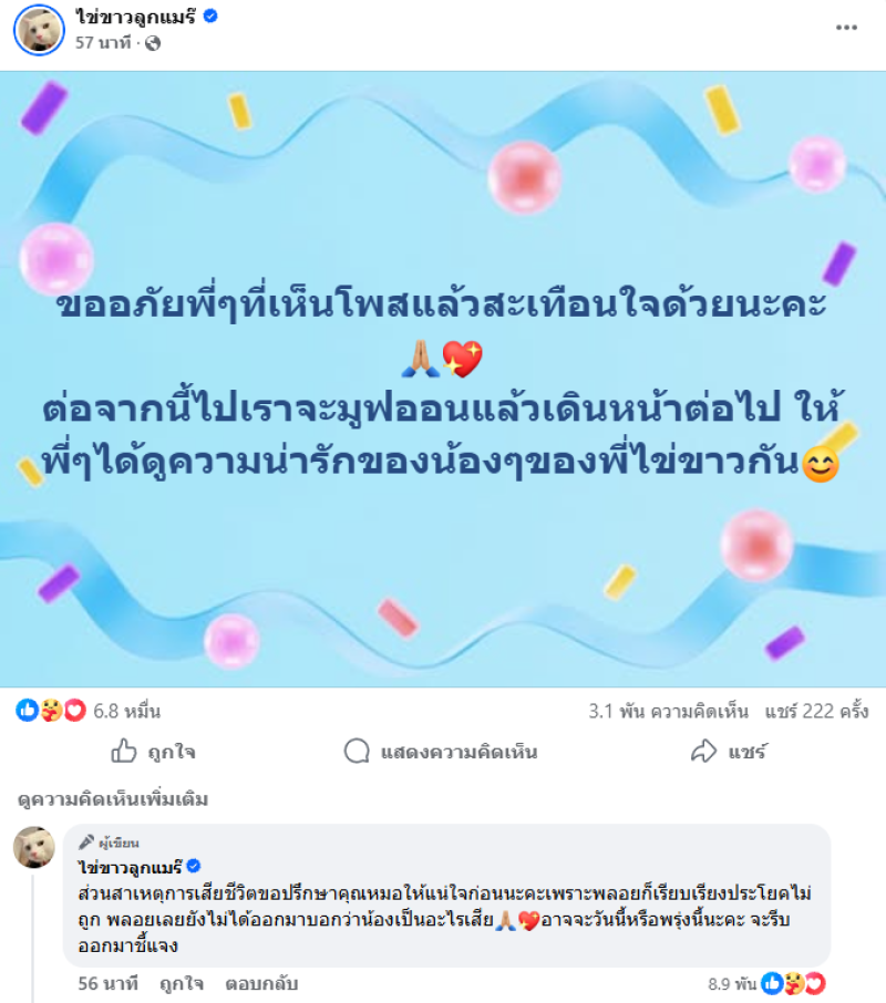 ล่าสุดเจ้าของไข่ขาว ได้ออกมาโพสต์ชี้แจงผ่านเพจไข่ขาวลูกแมร๊ หลังเกิดกระแสดราม่าจากกรณีโพสต์คลิปเปิดไพ่ดูดวงเกี่ยวกับไข่ขาว รวมถึงเหตุผลที่ยังไม่เปิดเผยสาเหตุการเสียชีวิต โดยระบุว่า